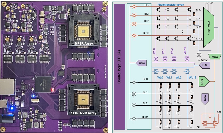 图3.基于光晶体管-忆阻器集成阵列与1T1R非易失性忆阻器集成阵列的可重构感存算一体硬件电路系统