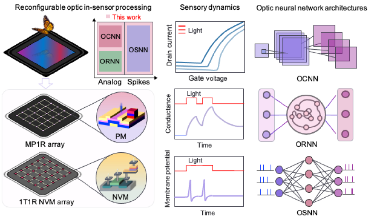 /集成电路高精尖创新中心黄如院士-杨玉超教授团队在Nature Electronics杂志上发表了题为《Reconfigurable in-sensor processing based on a multi-phototransistor-one-memristor array》的研究论文,在可重构感存算一体集成阵列与硬件系统取得重要进展。针对现有忆阻器视觉感知神经形态器件在动力学特性和编码功能上的局限以及集成硬件系统算法兼容性不足的问题,首次提出将莫特氧化物异质结结构忆阻器与光晶体管集成,构建了支持多种光图像编码功能的可重构硬件系统。这一系统能够实现光图像的时空、模拟与脉冲编码,并兼容生物启发式和机器学习架构的多种算法,通过与非易失性忆阻器阵列集成可支持多种光学神经网络(如光学卷积神经网络、循环神经网络、脉冲神经网络),从而执行多种计算视觉任务,包括识别静态、运动和彩色图像识别功能,为实现大规模可重构视觉计算硬件系统奠定了关键基础。