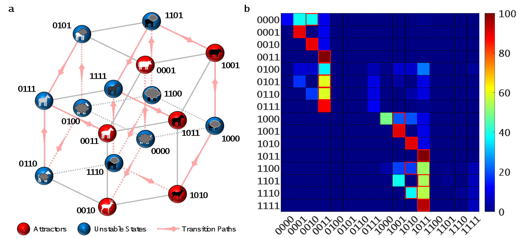 研究团队基于忆阻器自身的阈值、循环、非易失阻变特性,首次证明了由一列双极性忆阻器组成的电路本质上是一个吸引子网络。其中,忆阻器是一种特殊的人工神经元,它的非线性激活函数为双向回滞型,不同于常见的非线性函数,外部施加的电压定义了一个反对称权重矩阵,器件之间的相互作用实现网络的递归。这样的概念还可以扩展到其它器件种类,如单极性或阈值阻变器件,从而用于开发新的吸引子网络模型和硬件解决方案。