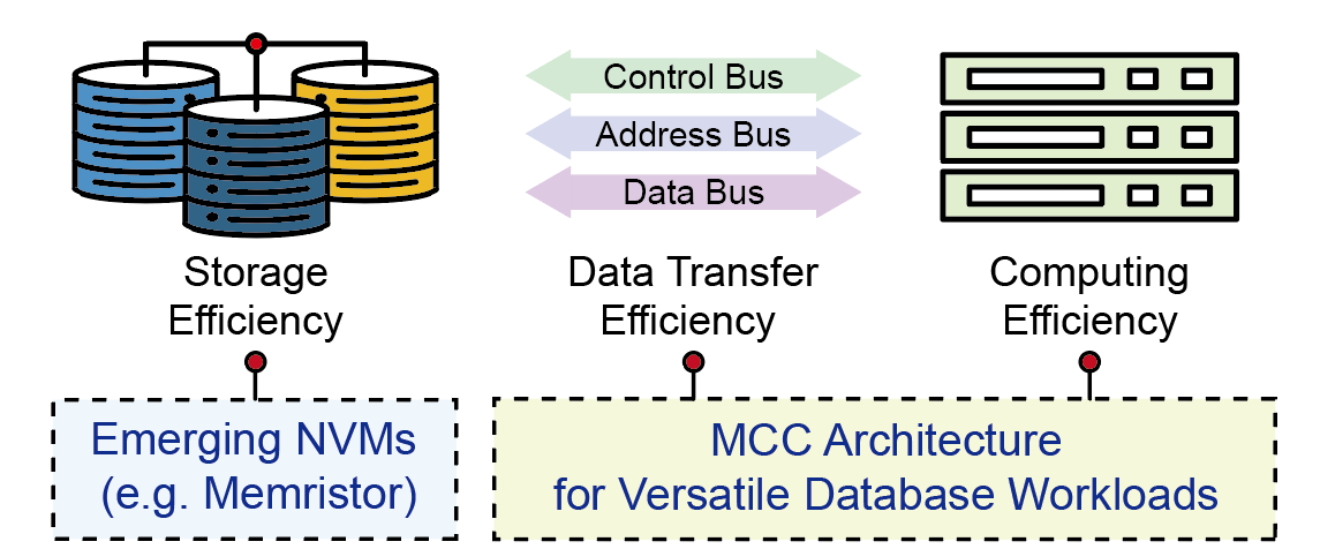 随着信息技术的迅猛发展,数据量的急剧增加和处理需求的不断提升,现代数据库系统面临存储效率、数据传输效率和计算效率三大挑战(见图1)。由于数据库需要存储大量数据较长时间,这就要求采用非易失性器件以降低关态功耗,其中忆阻器被认为是一个有吸引力的选择。除了提升存储效率,基于忆阻器的存储系统可以通过存储为中心的计算方式进一步提高数据传输和计算效率。利用更高的片上带宽取代传统存储器与处理单元之间的片外带宽,数据库处理系统可以显著提升其整体效率。然而,现有的存储为中心的计算架构尚未以非易失性器件为存储介质,并且无法支持泛用数据库算子的执行。