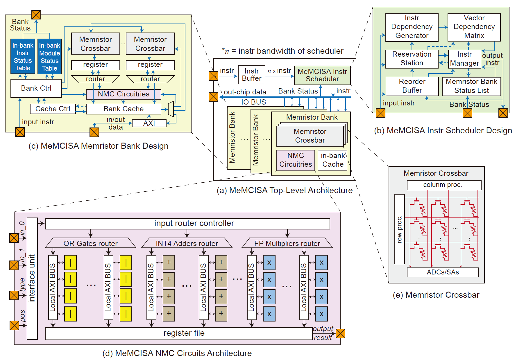 图2、(a) MeMCISA整体架构,(b)调度器设计,(c)计算部分架构设计,(d)近存电路示意图,(e)交叉阵列结构