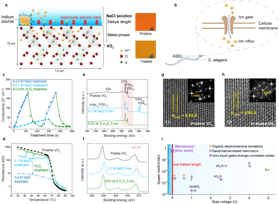 /集成电路高精尖创新中心唐克超研究员团队联合美国加州大学伯克利分校团队,开发出一种新型的无源忆感器(Memsensor)。该器件可通过材料表面的离子迁移速率感知液体中盐浓度,并将这种环境信息写入材料本身,实现无电源、可保持的“记忆”功能。忆感器由 VO2薄膜和紧贴其表面的铟(In)金属构成,利用固液界面的内建电场,在 Debye 长度范围内驱动 In³⁺注入 VO2表层,诱导 VO2发生由绝缘态向金属态的相变(图1)。器件的“感知”体现在电阻下降速率随盐浓度而变,“记忆”则源于掺杂引发的非易失相变,即使移除盐溶液后仍能保留电导状态。该研究不仅实现了感知与记忆功能的物理集成,还展示了其在仿生智能导航中的潜力。通过将多个忆感器加装于小船底部,团队实现了类似秀丽隐杆线虫(C. elegans)的基于“盐历史记忆”的化学导航行为,为水下机器人与环境智能交互提供了全新的低功耗解决方案(图2)。