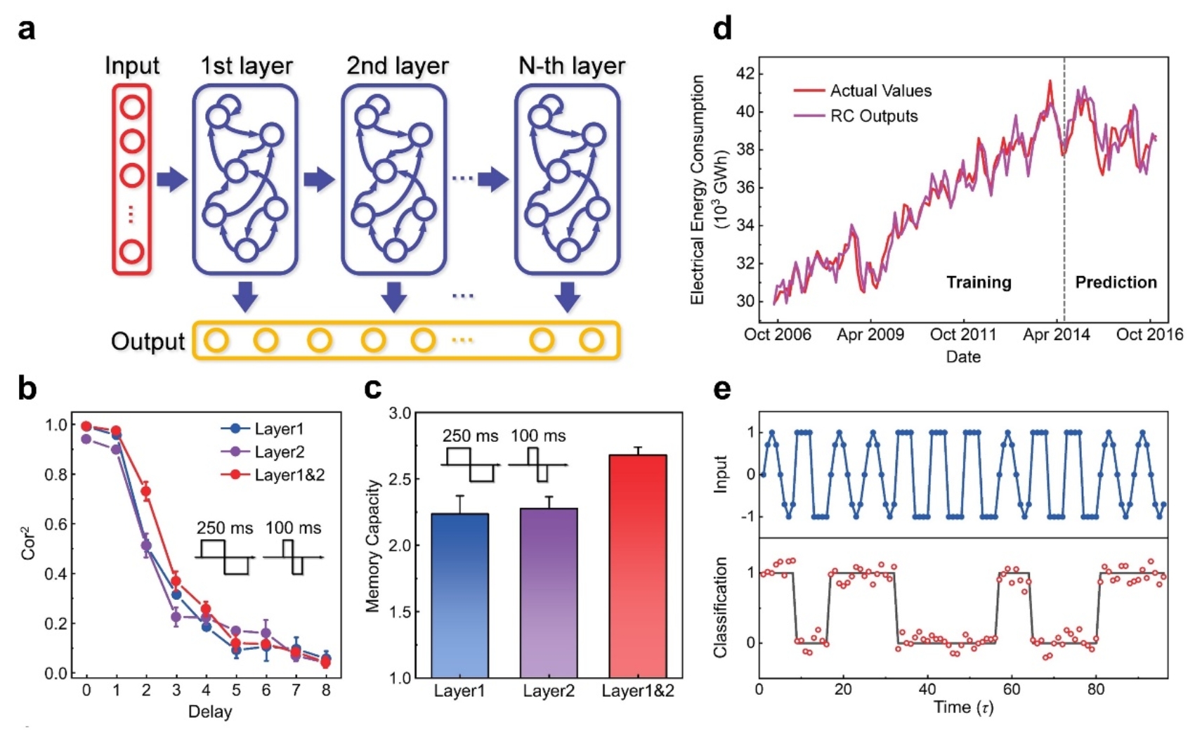 研究团队首先研制了可级联的单层储备池硬件,通过将动态忆阻晶体管与平面器件进行串联分压,实现了电压输入、电压输出的短时程非线性单元。由于输入和输出为相同的物理量,解决了通常情况下电压输入、电流输出器件难以直接级联的问题,为构建深度储备池计算硬件奠定了器件基础。基于该类短时程非线性单元,作者进一步制备了深度储备池硬件系统,并结合分时复用的虚拟节点方法获得了丰富的储备池状态。实验研究结果表明,相比同等规模的单层储备池计算系统,本工作所构建的深度储备池计算硬件具有更大的记忆容量、更丰富的储备池状态数、层次化的信息处理能力,并在波形分类、电能消耗预测等任务中展示了优异的性能,证明了深度储备池计算系统在时序信息处理任务中的潜力。