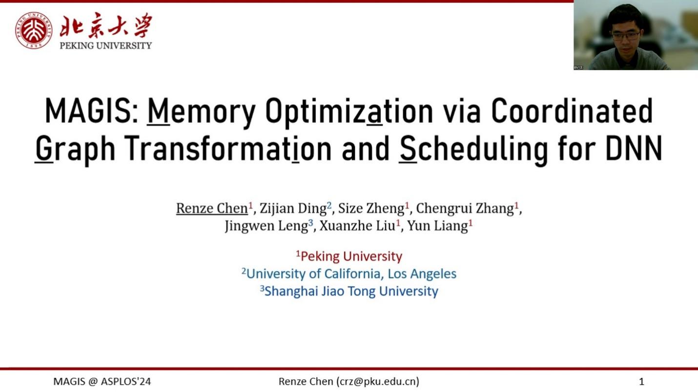 近年来,深度神经网络(DNN)的内存消耗迅速增加,这主要归因于部分张量的较长的生命周期和较大的形状。虽然图调度技术是内存优化放入有效手段,但是该技术往往会显著影响性能,并且优化空间受限。另一方面,已有的图变换技术主要侧重于优化性能而非内存。为了缓解上述问题,梁云团队提出了MAGIS,一个结合图变换与图调度的DNN内存优化框架。MAGIS利用树结构来表示裂变变换,并基于对图结构的分析构建了一个轻量的裂变变换搜索空间。MAGIS将一些图调度类型解耦为图变换与重排序,并设计了一种增量调度算法,从而高效地协调图变换与图调度。该工作以《MAGIS: Memory Optimization via Coordinated Graph Transformation and Scheduling for DNN》为题发表(博士生陈仁泽为第一作者,梁云教授为通讯作者)。