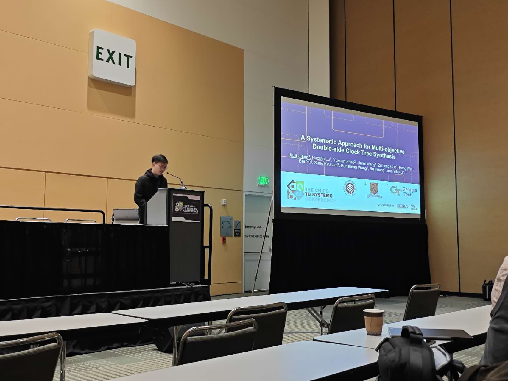 随着半导体器件尺寸缩放逼近物理极限,利用硅基板背面空间已成为未来集成电路发展的新趋势。目前已有多个研究通过改造现有后端工具,探索利用纳米硅通孔(nTSV)实现双面时钟树综合的潜力,但这些工作缺乏对设计资源分配和多目标优化的系统性考量。本工作提出了基于多目标优化的双面时钟树综合,包含分层时钟树布线、缓冲器与纳米硅通孔协同插入以及偏差微调等关键技术。结合设计空间探索方法,进一步提升了双面时钟树综合工具的设计能力,可以满足不同的实际设计需求。相比于当前最先进的设计方法,在开源的测试样例上,平均减少了55%的时钟延迟、 59%的时钟偏差、1%的缓冲器数量、20%的布线长度优化及31%的nTSV数量。该工作以《A Systematic Approach for Multi-objective Double-side Clock Tree Synthesis》为题发表(博士生江循为第一作者,林亦波研究员为通讯作者)。