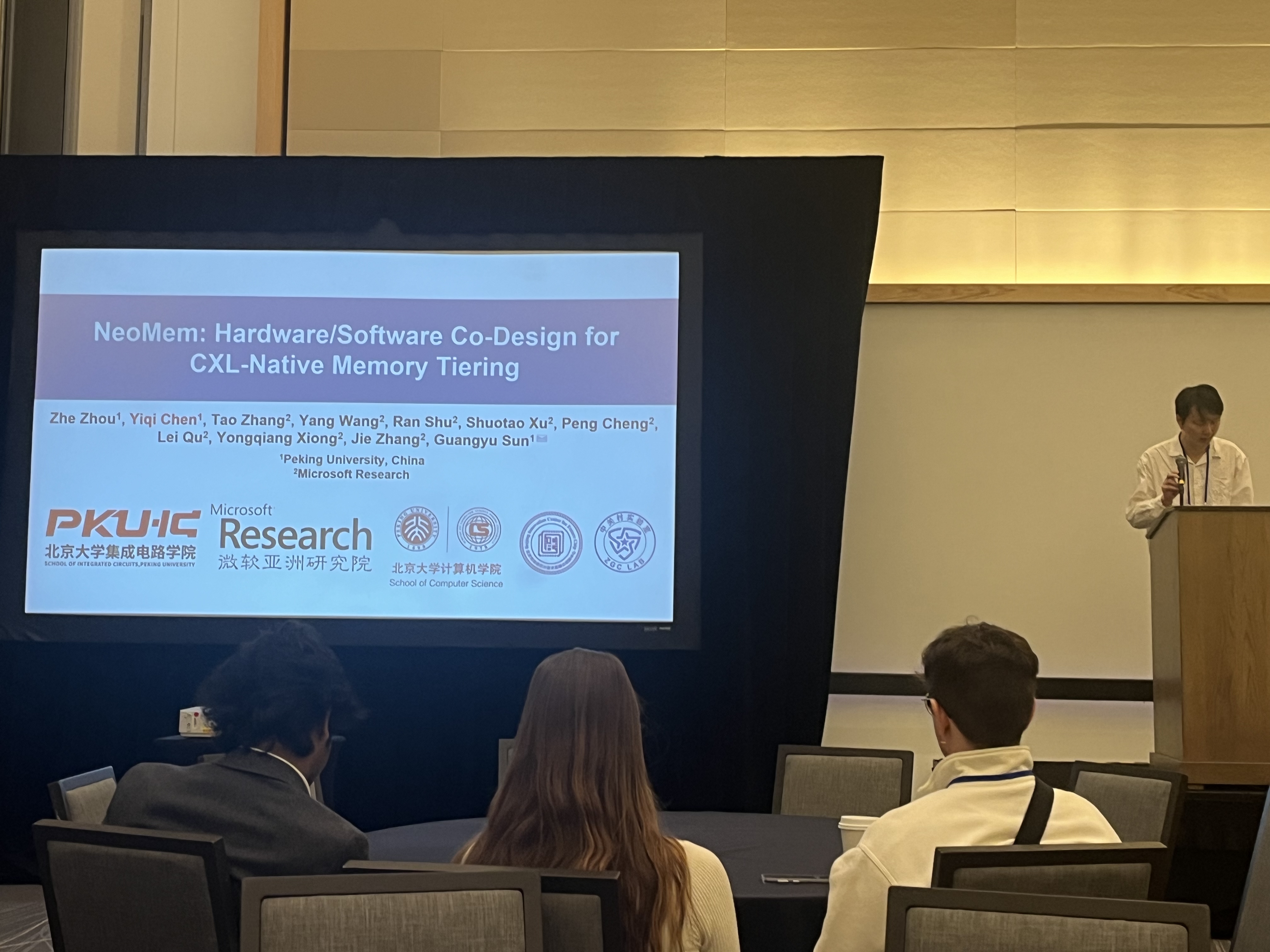 Compute Express Link(CXL)互连通过其字节可寻址的SerDes链路,使得将多种类型的内存集成到服务器中成为可能。由于存在不同的访问延迟,要充分释放基于CXL的异构内存系统的潜力,亟需高效的内存分层管理技术。然而,现有研究由于内存访问分析技术分辨率低且开销大,难以取得实质性进展。为应对这一关键挑战,孙广宇团队提出了一种名为NeoMem的创新内存分层解决方案,采用硬件和软件协同设计。NeoMem将内存分析功能卸载到CXL设备端控制器,并集成了一个名为NeoProf的专用硬件单元。NeoProf能够实时监控内存访问,并向操作系统提供关键的页面热点统计信息和其他有用的系统状态信息。在操作系统内核方面,孙广宇团队设计了一种全新的内存分层策略,基于NeoProf提供的统计数据,实现对热点页面的准确和及时提升。该工作在基于FPGA的真实CXL内存平台和Linux内核v6.3上实现了NeoMem。综合评估结果表明,与现有多种内存分层解决方案相比,NeoMem实现了32%至67%的几何平均加速效果。该工作以《NeoMem: Hardware/Software Co-Design forCXL-Native Memory Tiering》为题发表(博士生周哲与博士生陈奕奇为共同第一作者,孙广宇副教授为通讯作者)。