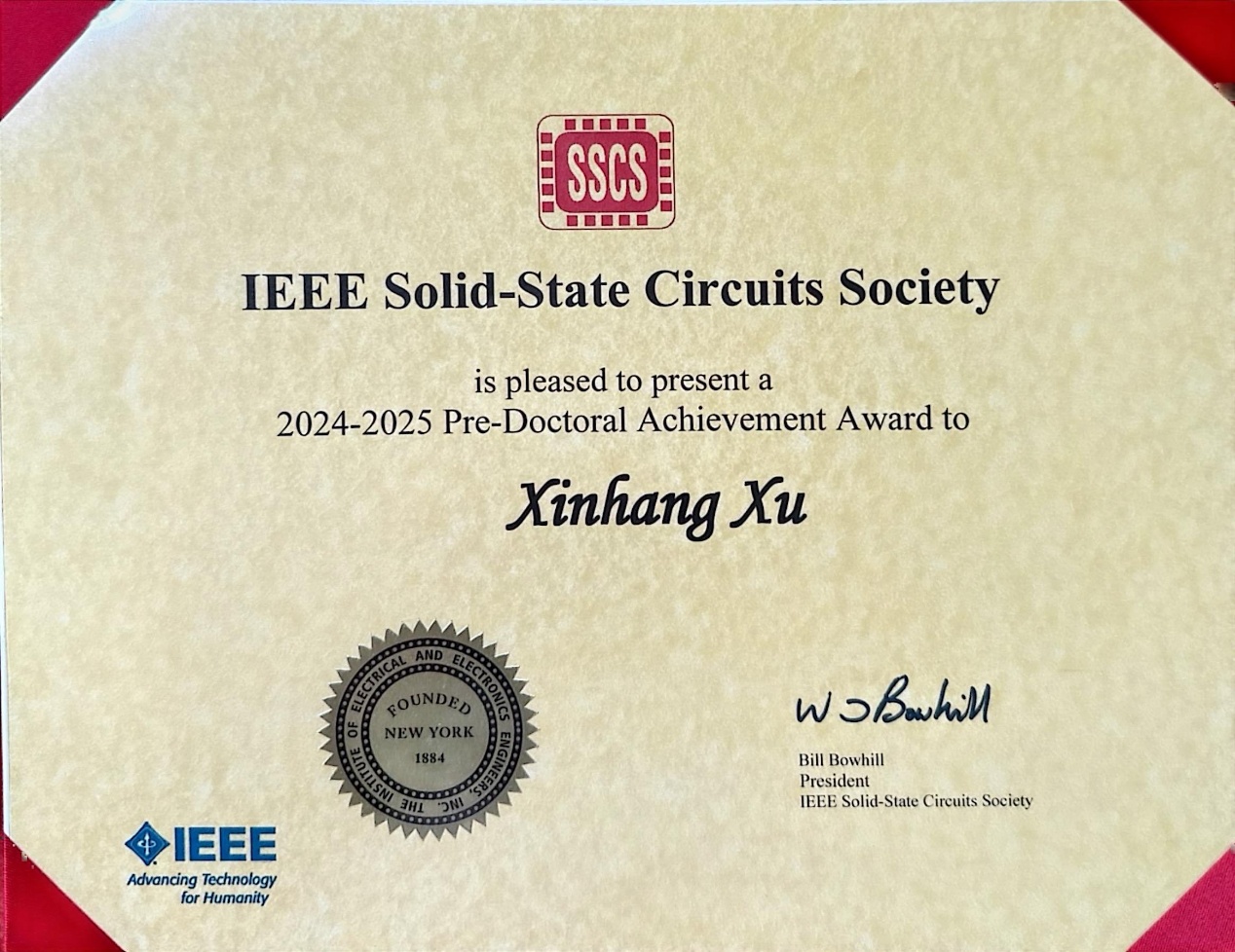 SSCS Predoctoral Achievement Award(国际固态电路协会博士生成就奖),每年2月中旬在美国旧金山召开的ISSCC会议上进行颁发。该奖评审委员会由国际工业界、学术界知名专家共同组成,用以表彰全球集成电路设计领域杰出的在读博士生。