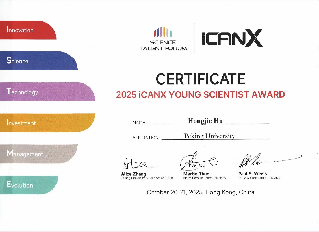 助理教授胡鸿杰凭借其在可穿戴超声成像技术领域的研究成果与发展潜力成功获得iCANX青年科学家奖。