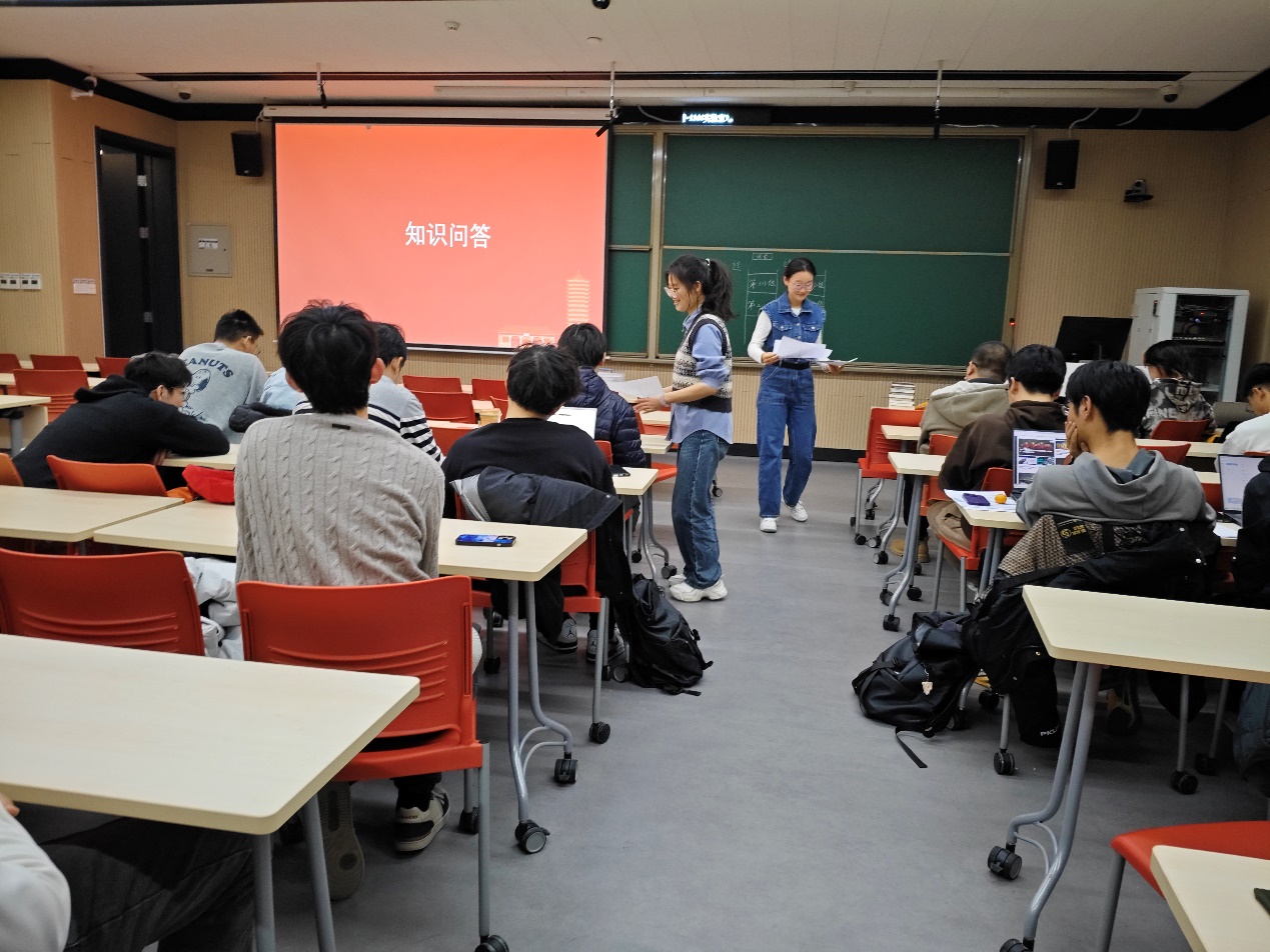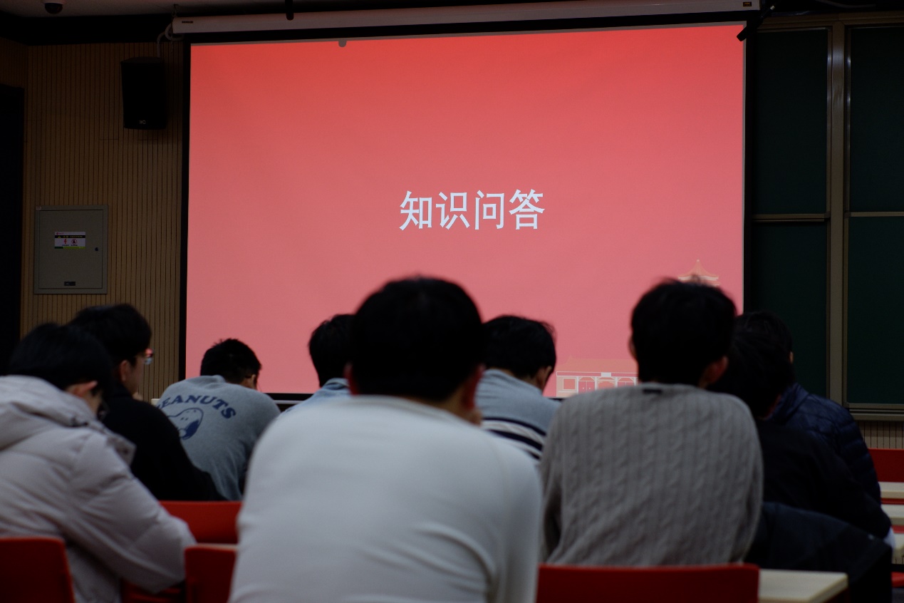 最后进入知识问答环节。首先,支部支书介绍了知识问答的比赛规则,随后进行了积分赛和抢答赛两轮问答。在该环节中,面对着一系列问题,大家或集体作答,或积极抢答,在欢快的氛围中收获知识。知识竞答结束后,各小组综合积分进行排名,获得了精美奖品。
