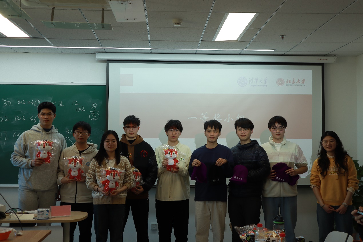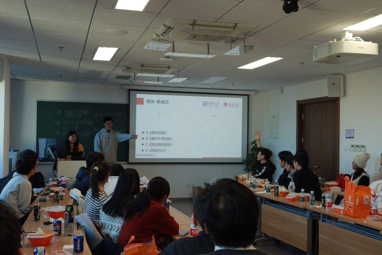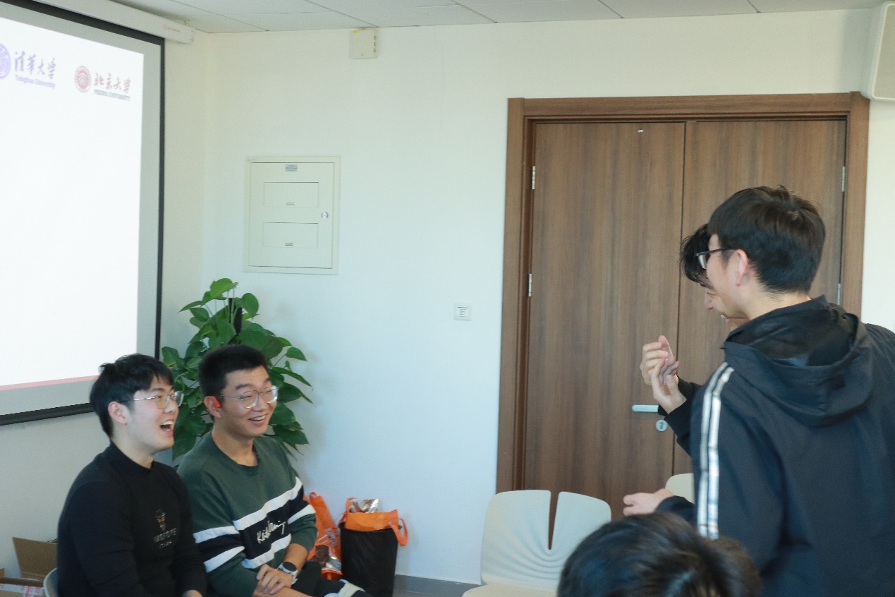 随后,同学们集体前往清华大学自强科技楼开展交流会。首先,两学生支部支书分别介绍了各自支部的基本情况,并分享了党日活动和理论学习的举办经验。随后,两支部进行了“听歌识曲”、“你划我猜”等小游戏环节,同学们就党史问答、专业知识、学校特色等进行比拼。结束后,综合各类小游戏的积分评选出了一、二、三等奖,双方同学也互相交换了纪念品。