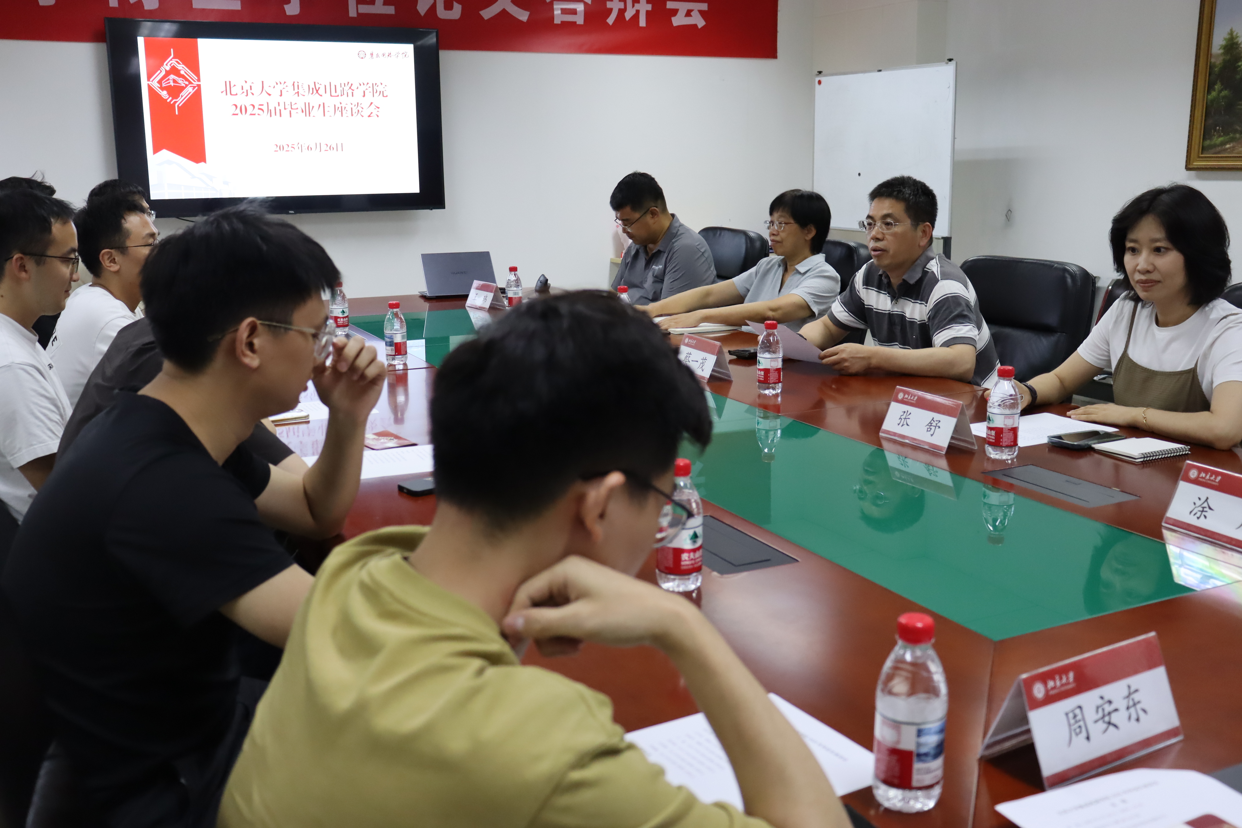 在微纳电子大厦205会议室召开2025届毕业生代表座谈会。学院院长蔡一茂,副院长刘晓彦、王玮,党委副书记张舒,院长助理涂成,团委书记王凌越,学工办周安东和2025届毕业生代表参加座谈。座谈会由张舒主持。