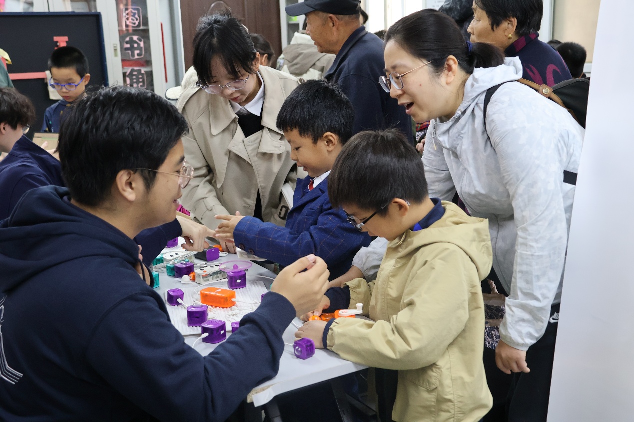 步入场地,首先映入眼帘的是互动游戏区域,互动游戏一共包含四个精心设计的关卡,分别是光镜探微、滚珠迷宫、电路拼装与FPGA演示。本次活动吸引了很多中关园社区的小朋友参与,他们入场后立刻对互动游戏产生了极大的兴趣,纷纷坐在摊位前细听讲解、动手实操。这些游戏的参与难度不高,不仅颇具趣味性,还蕴含着很多集成电路学科的基础知识。小朋友们用显微镜观察芯片的系统布局,可以具象地感受微米纳米这些生活中不常见的微观尺度;让小铁球在迷宫中运动并避开孔洞,生动模拟出了半导体中的载流子运动、陷阱捕获等事件,让小朋友理解晶体管内部的载流子要经历怎样复杂的过程才能去到需要的地方、发挥应有的作用;将各种声光电元件组合成闭合回路,起飞的扇叶、闪烁的灯泡、鸣响的喇叭涵盖了基本的电路组成原理与信息交互方式;FPGA演示环节用简单的代码完成软硬件协同,把对功能的想象转化为实用的逻辑。不久,小朋友们分别体验了游戏关卡,不只收获了活动的喜悦,也对集成电路基础知识有了一定的了解。