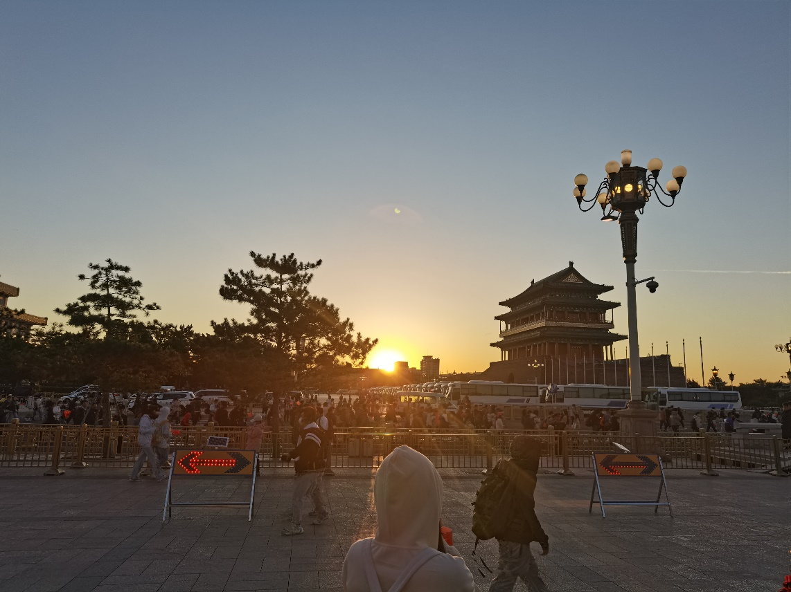 同学们见证了黎明第一缕阳光打破黑夜照到天安门城楼上