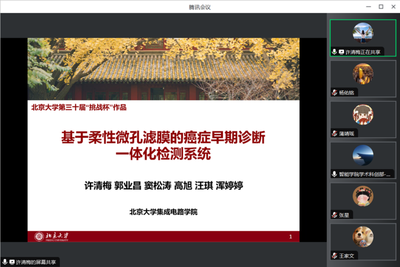 的许清梅同学分享了“基于柔性微孔滤膜的癌症早期诊断一体化检测系统”这一工作。恶性肿瘤是世界上每个国家的主要死亡原因和延长预期寿命的重要障碍,其早期多无明显症状,等患者出现特异性症状时,肿瘤常属晚期。因此急需开发一套用于癌症早期诊断的一体化精准检测系统。循环肿瘤细胞(CTC)作为癌症诊断的重要标志物之一,是肿瘤转移的元凶和主要载体。本作品围绕循环肿瘤细胞这一生物检测标志物,创新性地提出并设计了基于柔性微孔滤膜的多模式一体化系统,凭借在大体积临床样品中痕量CTC的高灵敏度检出技术在肿瘤早期诊断领域具有广泛应用前景。随后许清梅同学进行了经验分享。她强调,选题时应该结合实际需求,关注时事热点,阐明选题重要性。报告中内容需要丰富充实,逻辑清晰,阐明成果的实际应用性。在答辩时要保证PPT简洁易懂,逻辑性强,尽量多使用图片代替文字,如果有实物可以使用实物进行展示。