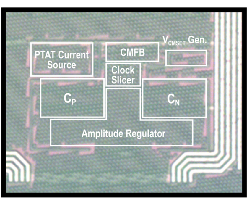基于上述创新理念与技术,课题组研制了一款基于22nm CMOS工艺的超低功耗32kHz晶体振荡器芯片。该电路在使用ECS-2X6X音叉型32kHz晶体下,在25˚C室温下的平均功耗仅为0.954nW,取得了已发表过的基于32kHz电流注入晶体振荡器中功耗最低的世界纪录。其在80˚C下的功耗仅为1.90nW,为低功耗晶体振荡器中的世界纪录。该晶体振荡器在长时工作下表现出了低至6ppb的Allan误差(Allan Deviation),取得了单电源晶体振荡器电路的长时稳定性世界纪录。该电路可广泛应用于面向环境应用的IoT芯片中,作为其中低功耗高精度实时时钟模块的核心。
