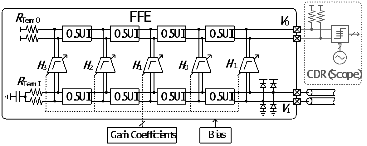 基于上述创新技术,课题组研制了一款基于延迟线的200Gb/s接收机前馈均衡器芯片。该芯片实现了对200Gb/s数据的均衡,可提供高达17.2dB的均衡能力,且能效比仅0.43pJ/b,均为接收机连续时间前馈均衡器的最优水平。该均衡器芯片具有高带宽、低功耗、低噪声的优势,可广泛用于数据中心、Chiplet等串行数据传输应用中,为未来短距200Gb/s接收机提供了全新的低功耗解决方案。