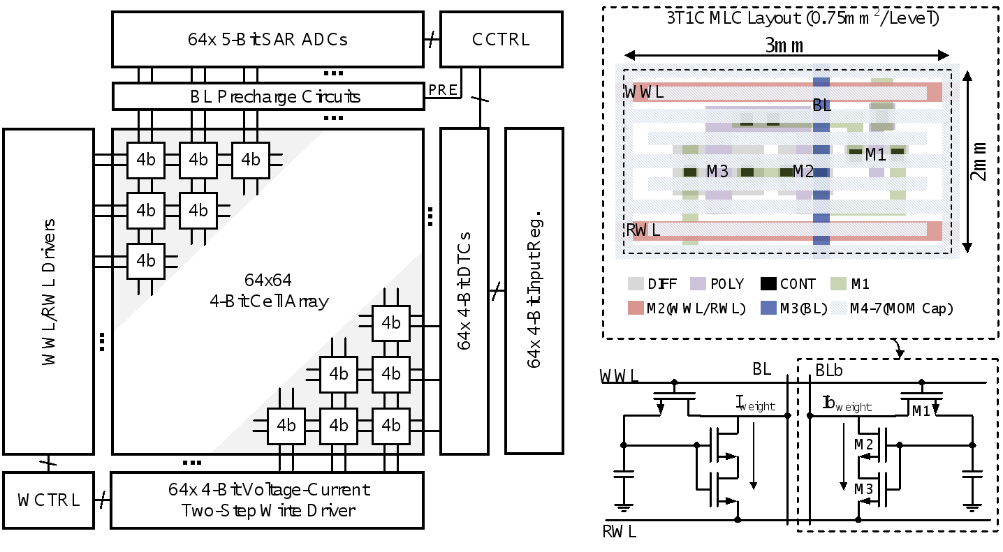 该工作以A Calibration-Free 15-level/Cell eDRAM Computing-in-Memory Macro with 3T1C Current-Programmed Dynamic-Cascoded MLC achieving 233-to-304-TOPS/W 4b MAC为题,发表于今年CICC,文章的第一作者是成人影片 博士后宋嘉豪,文章的通讯作者是唐希源研究员和王源教授。