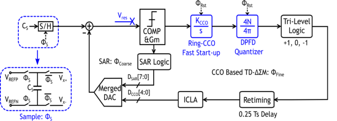 成人影片 王源教授-唐希源研究员团队研制了一款时间域电容传感读出芯片,通过架构和电路层面协同设计与创新,该芯片实现了国际领先的读出能效和转换速度。在架构方面,该芯片采用了时间域信号处理,相比于传统的电压域设计,该方案更加高效、并能充分利用工艺演进带来的优势。该架构利用了单次采样多次量化的方案,大幅降低传感器采样开销,有效提升了系统能效并降低了转换延迟。在电路方面,该芯片利用双鉴频鉴相器对所有的相位信息进行量化,相比传统的鉴相器实现了2倍的转换精度提升。此外,该芯片设计了专门针对压控振荡器的快速启动技术,能够实现快速上下电,降低转换延迟的同时保证了首次转换精确(first conversion accurate),大幅拓展了其应用场景。