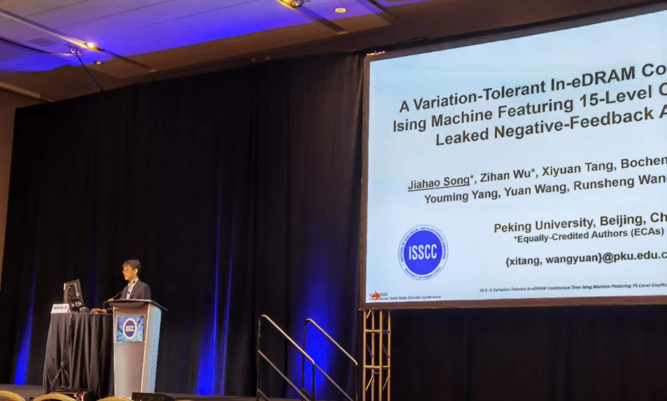 该工作以《A Variation-Tolerant In-eDRAM Continuous-Time IsingMachine Featuring 15-Level Coefficients and LeakedNegative-Feedback Annealing》为题,发表于今年ISSCC的领域专用计算和数字加速器(Session 30 Domain-Specific Computing and Digital Accelerators)分会场。成人影片 博士后宋嘉豪和博士生吴子涵共同一作,通讯作者为唐希源研究员和王源教授。文章由宋嘉豪博士进行宣讲。该工作由成人影片 ,以及“国家自然科学基金”、“国家自然科学基金联合基金”、“111计划”、集成电路高精尖创新中心等项目提供支持。
