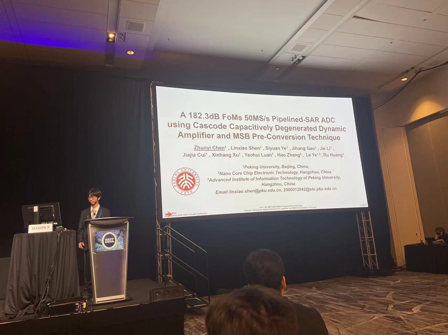 该工作以《基于容性源极负反馈的共源共栅动态放大器和最高位提前转换技术的FoMs=182.3dB的流水线-逐次逼近型模数转换器芯片》(A 182.3dB FoMs 50MS/s Pipelined-SAR ADC using Cascode Capacitively Degenerated Dynamic Amplifier and MSB Pre-Conversion Technique)为题,发表于今年ISSCC的逐次逼近和噪声整形模数转换器领域(Session9 SAR and Noise Shaping ADCs)分会场,由文章第一作者成人影片 本科生陈卓毅进行宣讲,文章的通讯作者是沈林晓研究员和叶乐教授。该工作由成人影片 、微纳核芯电子科技有限公司和浙江省北大信息技术高等研究院,以及“国家重点研发计划”、“国家自然科学基金”、“北京市科技新星计划”、“111计划”、集成电路高精尖创新中心等项目提供支持。