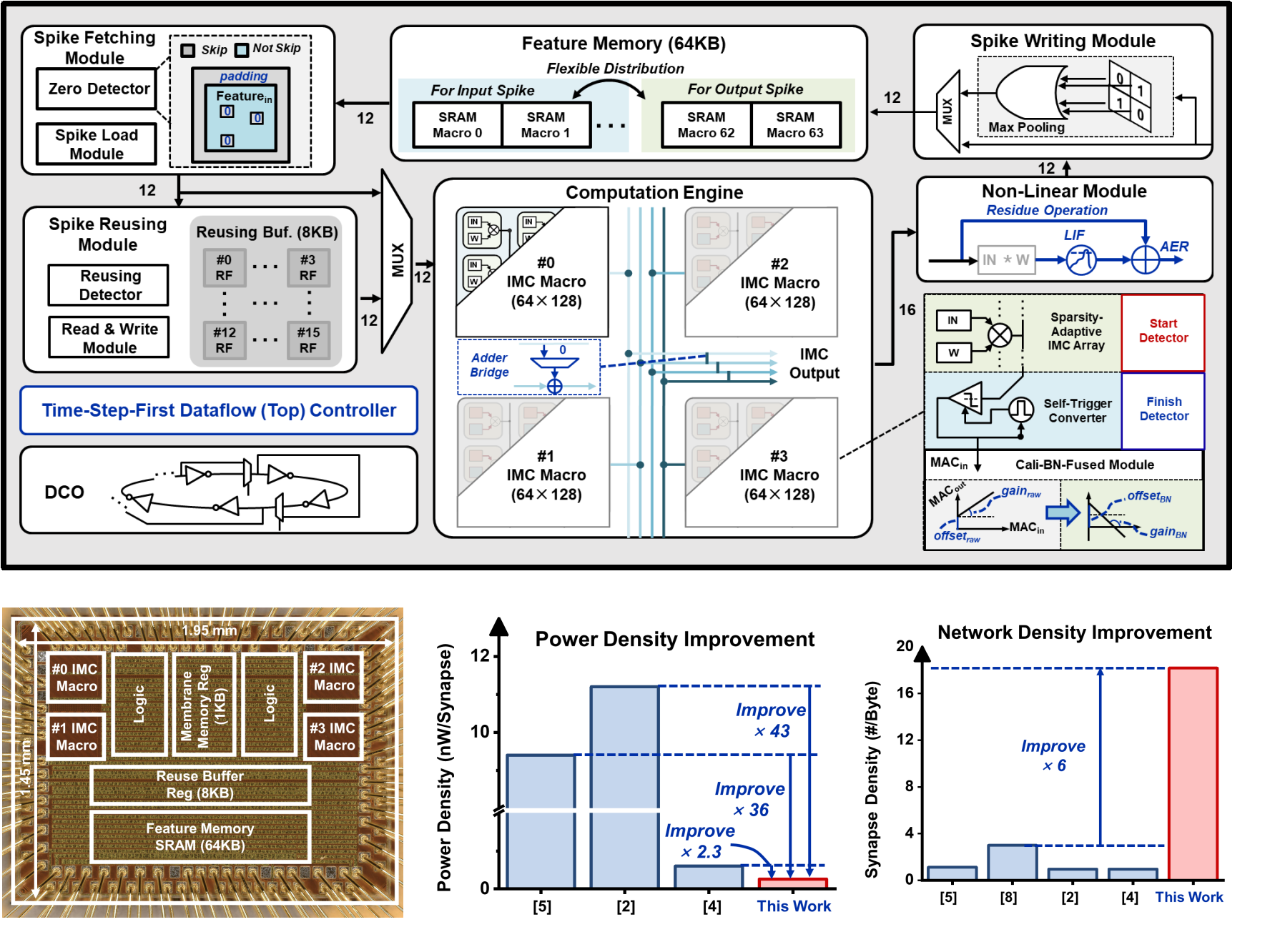 面向边缘AI的应用场景,均使用稀疏脉冲作为信息介质的动态视觉传感器和脉冲神经网络推理引擎提供了可靠的高能效解决方案。课题组为了在有限的存储资源和功耗下,芯片能够集成更多的突触连接数量以提升芯片的推理能力,针对传统脉冲神经网络芯片中存在的突触权重,膜电位等数据类型在多时间步上数据搬运的问题,创新性地融合了时间步优先的数据流和存算一体阵列技术,使得权重在整个时间窗口内缓存于存算一体的子阵列中,最小化数据的片内外搬运次数。