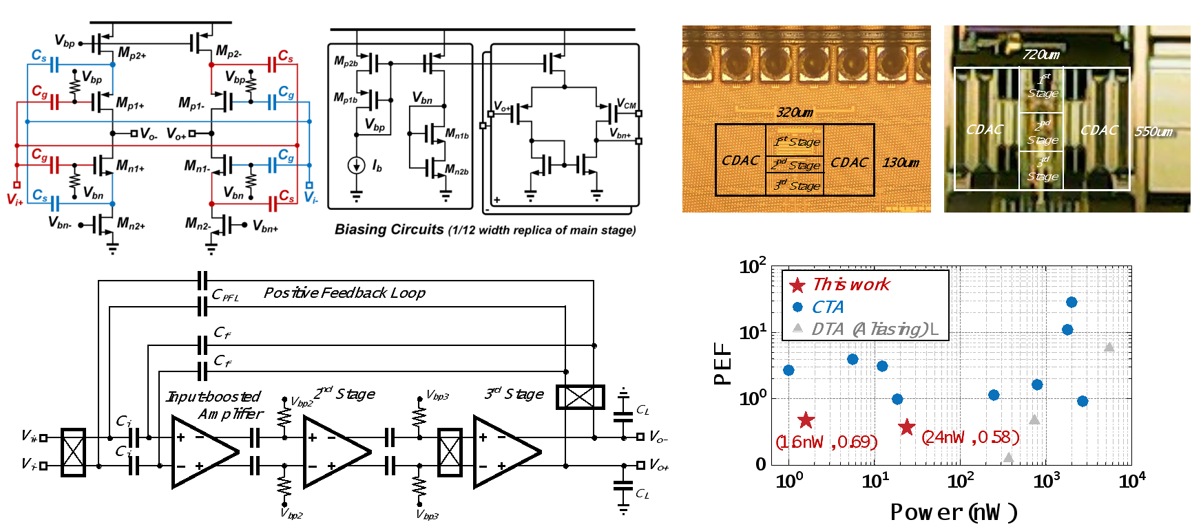 基于上述创新理念与技术,课题组在180nm CMOS和22nmCMOS下分别研制出了一款高能效放大器。在180nm工艺下该结构以24nW的功耗实现了1.6kHz带宽内5uV的积分噪声;在22nm工艺下以1.6nW的功耗实现了230Hz带宽内8uV的积分噪声;在综合评估放大器能效的指标(Power efficiency factor, PEF)下,分别达到了0.58和0.69的指标,是目前能效最优的连续时间模拟前端放大器。该放大器在不同温度与电压下进行了验证,保证了其在复杂工作环境下的稳定性。该电路可广泛应用于面向传感应用的物联网芯片中,作为其中模拟信号链最前端的模块。