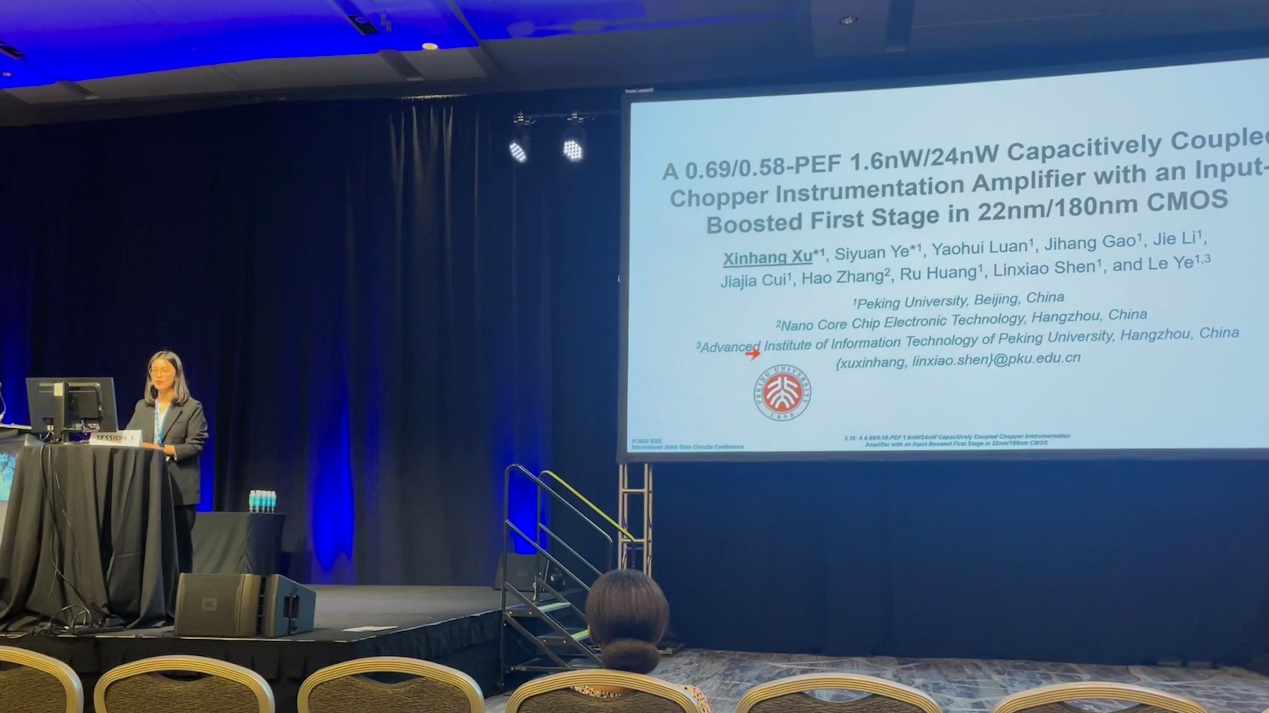 该工作以《A 0.69/0.58-PEF 1.6nW/24nW Capacitively Coupled Chopper Instrumentation Amplifier with an Input-Boosted First Stage in 22nm/180nm CMOS》为题,发表于今年ISSCC的模拟技术分会场(Session 3 AnalogTechniques)。文章第一作者成人影片 博士生许欣航进行宣讲,成人影片 博士生叶思源为共同一作,文章的通讯作者为沈林晓研究员和叶乐教授。该工作由成人影片 、微纳核芯电子科技有限公司和浙江省北大信息技术高等研究院,以及“国家重点研发计划”、“国家自然科学基金”、“北京市科技新星计划”、“111计划”、集成电路高精尖创新中心等项目项目提供支持。