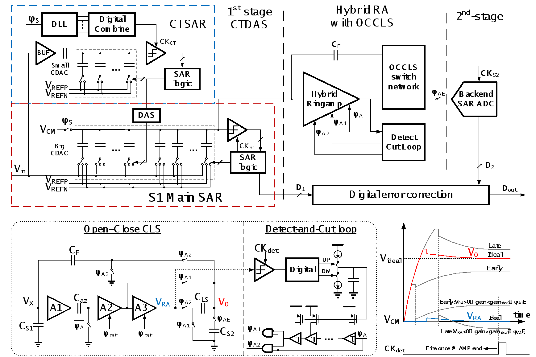 针对以上瓶颈,成人影片 黄如院士-叶乐教授团队,针对转换级和级间放大器两个方面提出解决方案。转换级方面,本工作提出了基于连续时间逐次逼近型模数转换器的采样转换并行技术,创新性地将模数转化器的采样过程与高位量化过程并行起来,从而在保持高能效的同时显著缩短转换级的采样转换时间,提升了整体的速率;级间放大器方面,本工作首次提出了基于先开环后闭环的相关电平抬升技术,利用开环放大显著提升余量放大的速率,同时采用了自检测切断环路用于实现工艺电压温度鲁棒的高增益。此外,本工作还提出了混合静态-动态环形放大器的电路架构,显著提高了级间放大器的噪声和能效性能。在提高采样转换速率的同时,本工作实现了高速高精度模数转换器的能量效率世界纪录,相较现有工作将能效提升将近一倍。