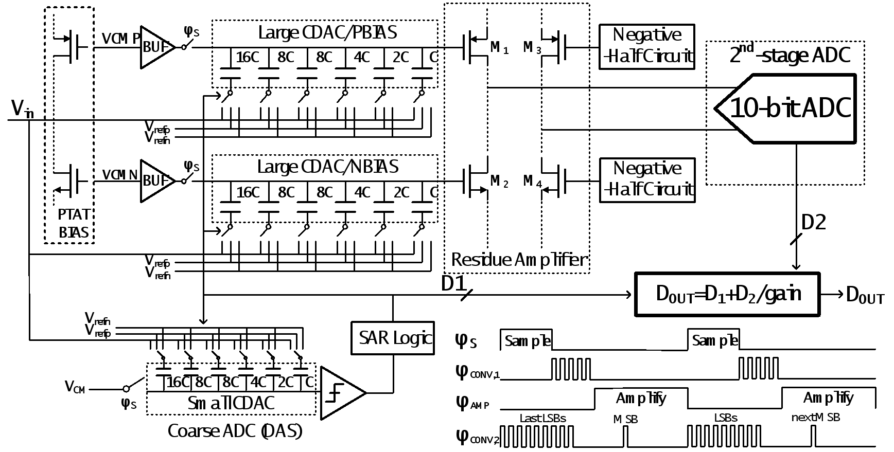 针对以上问题,成人影片 黄如院士-叶乐教授团队,首次提出了共源共栅的容性源极负反馈的动态放大器和最高位提前转换技术:其中共源共栅的容性源极负反馈的动态放大器改良了之前的技术,具有高线性度和高增益的特点,同时采用了温度补偿的电流偏置方案提升了PVT涨落下的性能鲁棒性。而另一方面,最高位提前转换技术在余量放大的过程中进行了第二级最高位的转换,这不仅进一步提高了动态放大器的输出摆幅,同时让第二级的最高位切换更快稳定。值得一提的是,这个技术获得的这些好处并不需要引入额外的硬件开销。利用以上技术,本工作提出了一个高能效、高增益、高线性度、高输出摆幅且PVT鲁棒的动态放大器,并实现了一个高能效的流水线-逐次逼近型模数转换器芯片。