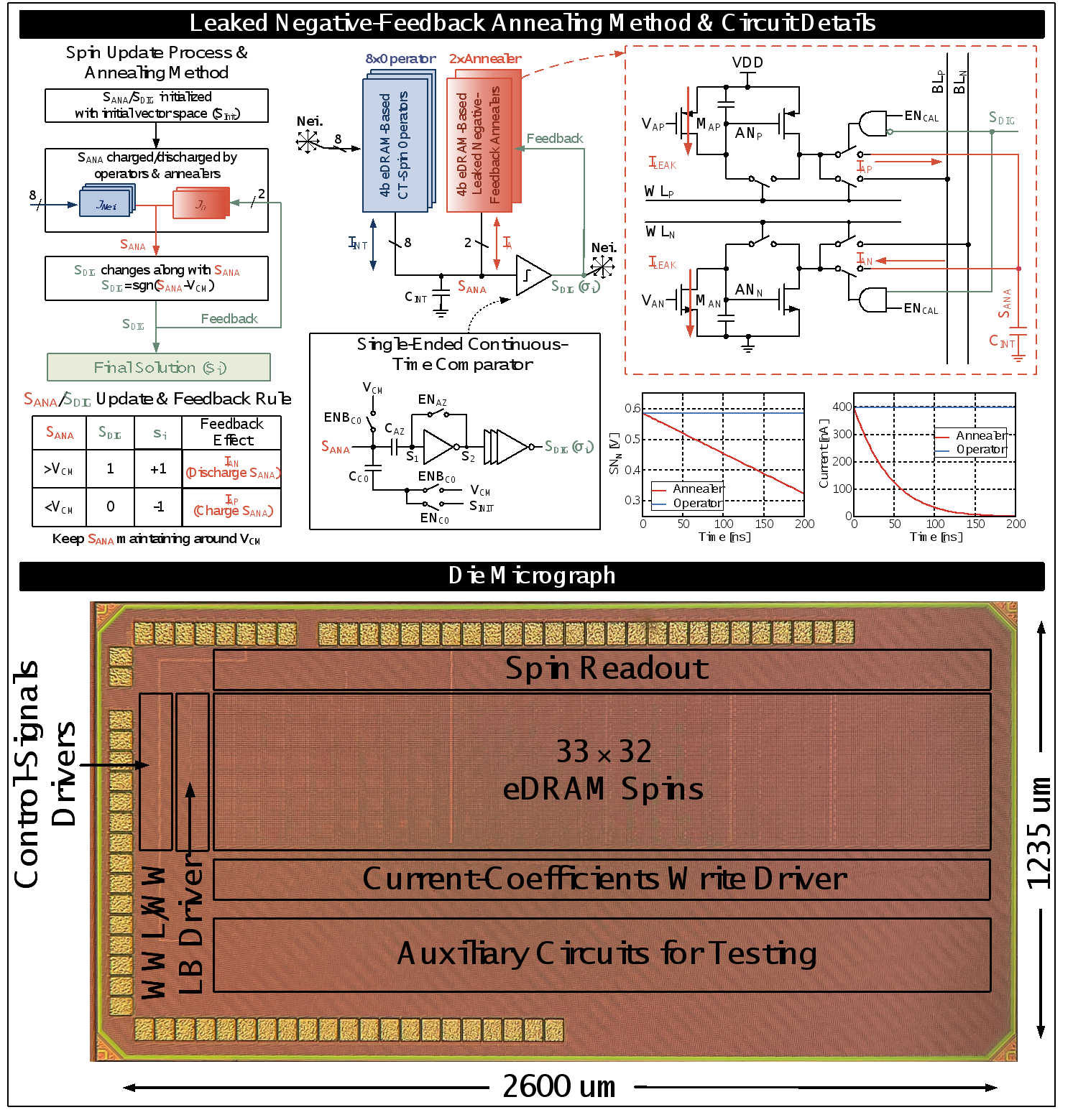 该工作面向组合优化问题求解,针对不断提升的计算速度、系数精度、与求解质量需求,设计并实现了一款具有多值互联系数,嵌入退火功能的连续时间存内伊辛机芯片,突破了传统连续时间伊辛机的系数精度与求解质量瓶颈。