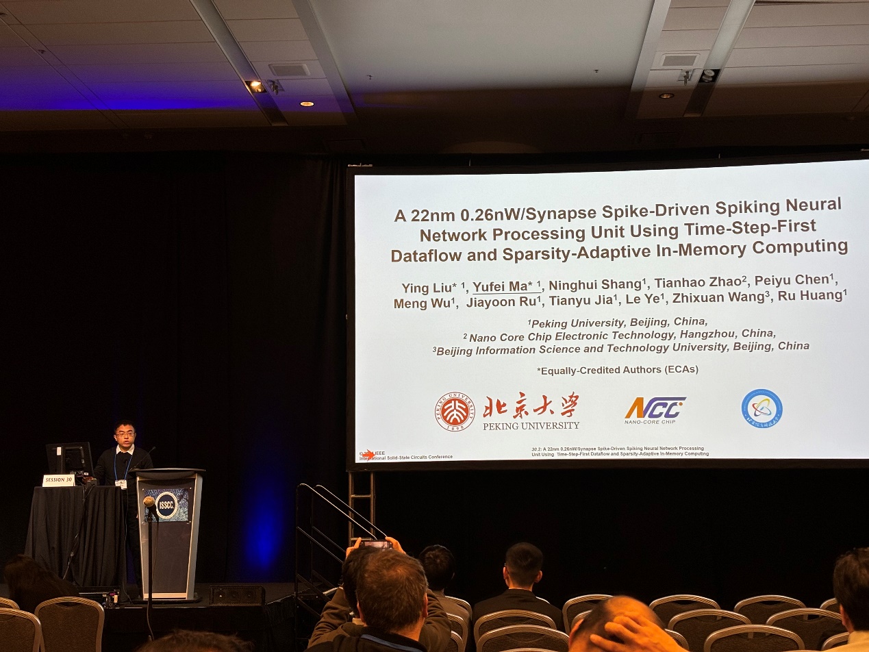 该工作以《基于时间步优先数据流和稀疏自适应存内计算技术的0.26nW/突触脉冲神经网络处理单元》(A 22nm 0.26nW/Synapse Spike-Driven Spiking Neural Network Processing Unit Using Time-Step-First Dataflow and Sparsity-Adaptive In-Memory Computing)为题,发表于今年ISSCC的领域专用计算和数字加速器(Session 30 Domain-Specific Computing and Digital Accelerators)分会场,该文章第一作者为成人影片 博士生刘影和马宇飞研究员,并由马宇飞研究员进行宣讲,通讯作者为成人影片 叶乐教授和王志轩。该工作由成人影片 、微纳核芯电子科技有限公司和北京信息科技大学,以及“国家自然科学基金”、“浙江省重点研发计划”、“111计划”、集成电路高精尖创新中心等项目提供支持。