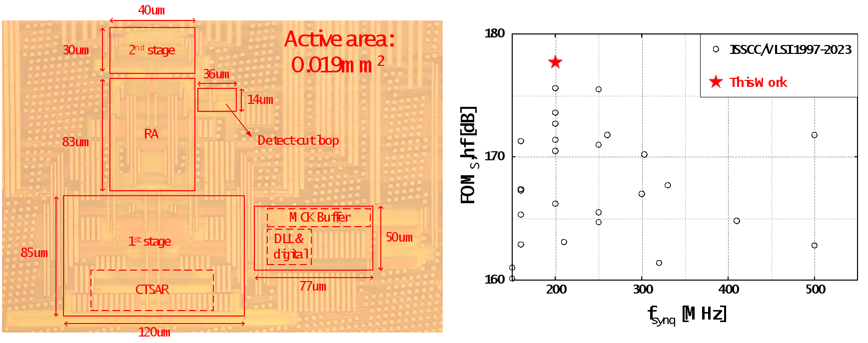 基于上述架构和电路层面的创新,课题组研制了一款基于22nm CMOS工艺的高速高精度高能效的模数转换器芯片。在22nm工艺下,该芯片在200MS/s的采样率下实现了70.7dB SNDR的精度和2.0mW的功耗,在所有相同或更高采样率的模数转换器中达到了能量效率的世界纪录(177.7dB FoMs),相较前人的工作将能效提升了将近一倍。该电路具有高速,高精度,高能效等特点,可广泛应用于宽带通信和射频前端,高保真音视频信号接口处理,工业控制测量等应用中。