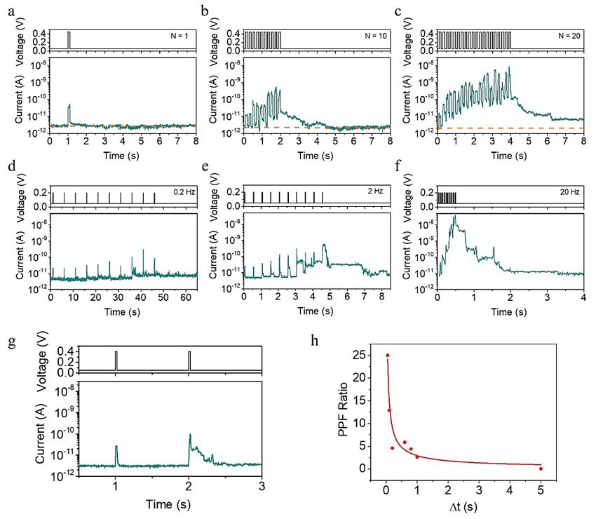 双脉冲易化(paired-pulse facilitation, PPF)是生物突触中的特征现象,当施加两个连续脉冲时,第二个脉冲的响应幅度会大于第一个,且依赖于两个脉冲的时间间隔。本文报道的人工突触器件也可以模拟这一过程。而且,这些行为可以通过施加脉冲期间Ag纳米团簇向内的电化学迁移以及脉冲间隔期间向外的热力学扩散之间的竞争效应来进行解释。