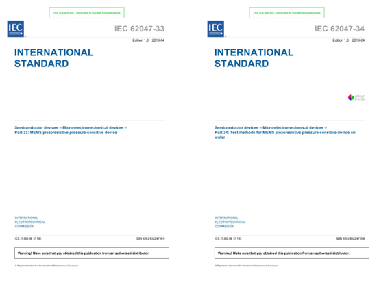 已发布的两项IEC国际标准是关于MEMS压阻式压力敏感器件的标准,其中IEC 62047-33规定了压力敏感器件的性能参数、环境试验和疲劳寿命的试验方法,IEC 62047-34规定了压力敏感器件晶圆级性能参数试验方法。