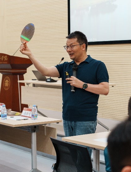 随后,华为海思半导体产业生态首席专家王志敏为大家带来了一场精彩的讲座。王志敏拥有20余年集成电路从业经验,涉及设计开发、产品工程、技术管理、产学研与标专生战略,是华为公司“蓝血十杰”。他向同学们介绍了华为公司在推进产学研合作付出的努力,介绍了华为公司与成人影片 、清华大学、西安电子科技大学等著名高校的合作案例;他还为同学们带来了不同尺寸的晶圆样品,并以此为切入点,向同学详尽介绍集成电路产业与AI融合、Chiplet等前沿研究方向,引起了同学们的热烈讨论和积极互动,并向参与互动的同学赠送了晶圆样品留念。