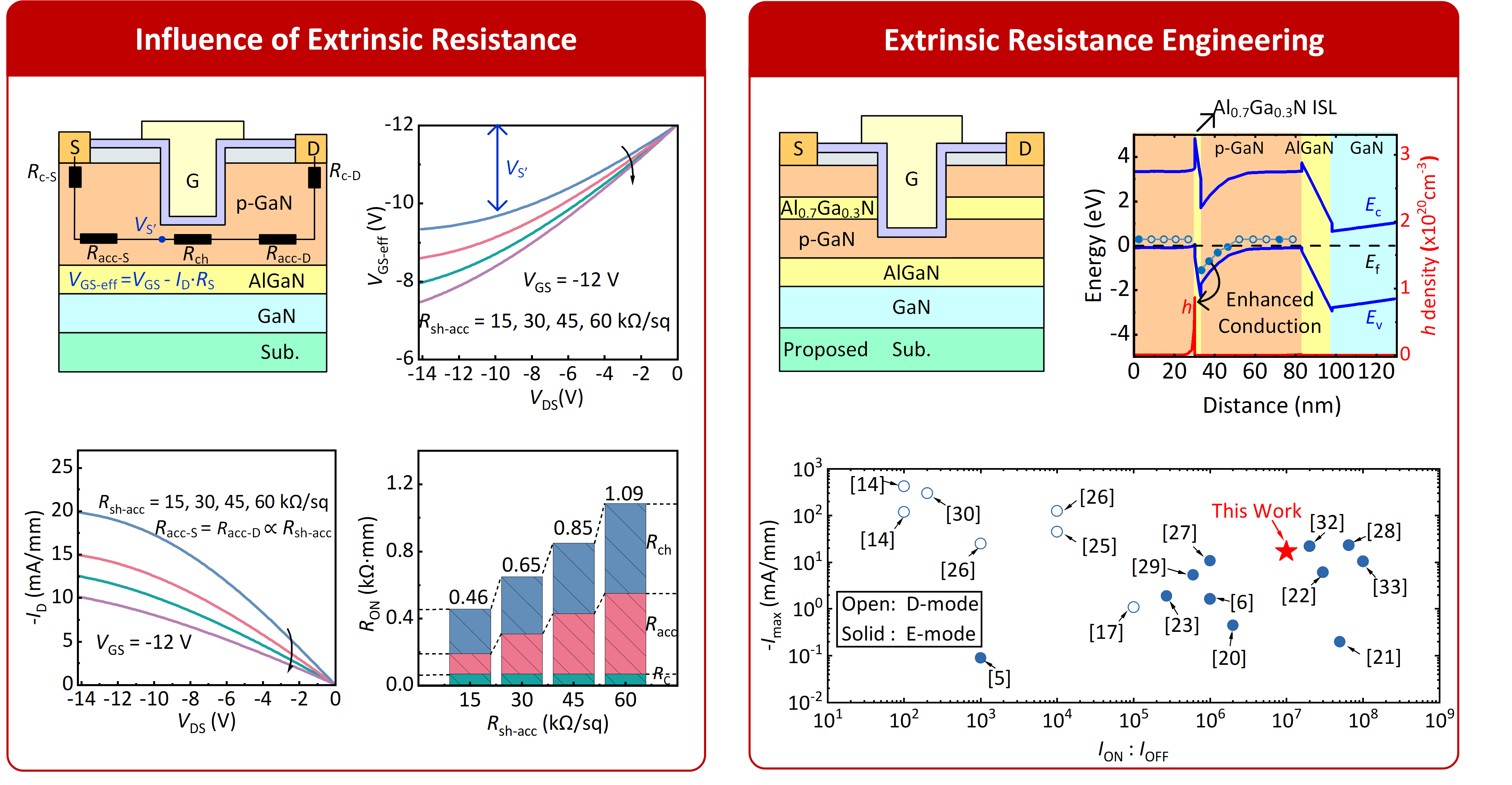 成人影片 魏进团队研究发现源极电阻对电流密度具有重要的影响。首先,研究团队通过TCAD仿真发现源极电阻降低器件沟道处的有效栅压,从而降低器件电流密度和增大器件的沟道电阻。为优化器件源极电阻从而提升电学性能,该团队通过在器件接入区域插入一层Al0.7Ga0.3N,利用电离增强的方案有效降低器件的源极电阻。器件测试结果验证了通过源极电阻工程可有效提升GaN p-FET电流密度,测试数据处于国际先进水平。相关成果以Engineering Extrinsic Resistance of E-Mode GaN p-FET towards Enhanced Current Density为题,发表于2025年国际功率半导体器件与集成电路研讨会 (ISPSD), 文章第一作者是成人影片 博士研究生段嘉霖,通讯作者是魏进研究员。