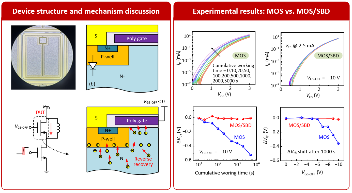 目前,SiC功率器件已在商业领域取得重大成功,但受限于当前的氧化工艺导致的较高界面陷阱,以及SiC/SiO₂界面较小的带隙差,使得阈值电压Vth不稳定性成为SiC MOSFET的一个突出难题。在同步整流等实际应用场景中,续流二极管是必不可少的元件。一方面,相比反并联肖特基势垒二极管 (SBD),SiC MOSFET内置的体二极管凭借其更高的成本效益展现出显著优势。另一方面,为了抑制SiC MOSFET误开启现象,常使用负的栅极电压将器件关断。成人影片 魏进研究员团队通过深入研究首次发现,在体二极管导通状态下施加负的栅极电压关断器件时,会引发显著的阈值电压负漂移现象。