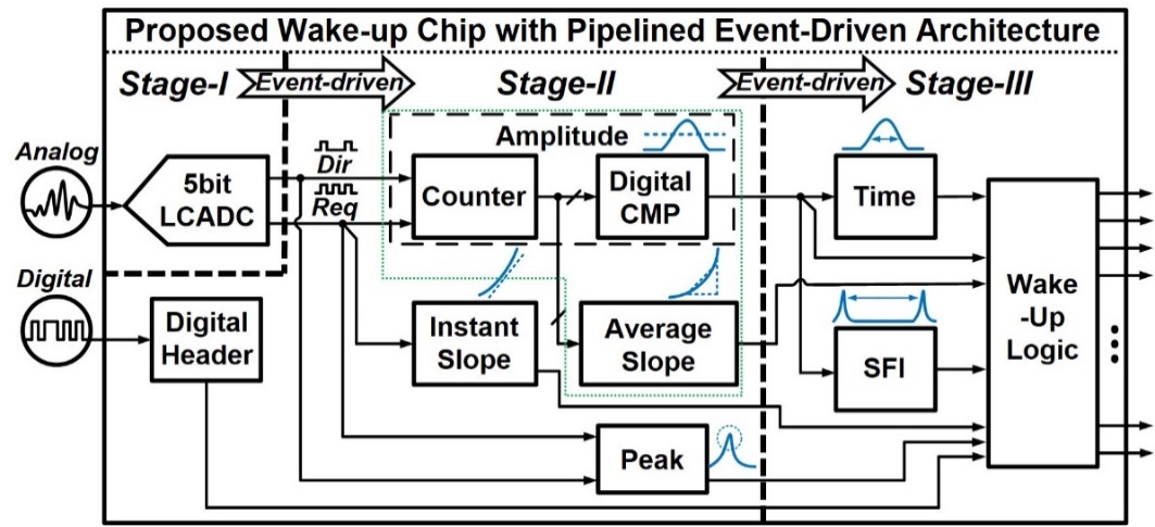 基于上述创新技术,课题组研制了一颗极低功耗物联网通用唤醒芯片,平均功耗仅为57纳瓦,比当前国际同类工作的最好水平提升了30倍。该芯片演示了心率异常预警、心电T波异常预警、癫痫预警、语音关键词包络唤醒等典型物联网应用场景,芯片与微控制器MCU芯片等高性能模块配合,可以在保证极低功耗的前提下实现更多复杂的物联网唤醒功能。该工作首次提出的异步流水线事件驱动型架构,为极低功耗物联网芯片领域的研究提供了一种突破现有功耗瓶颈的研究思路和解决路径。