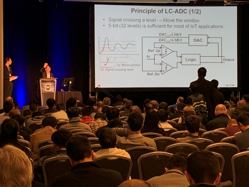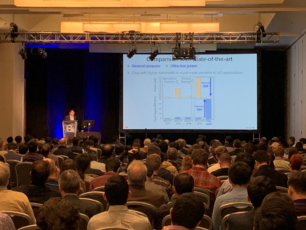 该工作以《面向物联网应用的基于异步流水线事件驱动型架构和时域屏蔽LC-ADC技术的57nW软件定义常开唤醒芯片》(A 57nW Software-Defined Always-On Wake-Up Chip for IoT Devices with Asynchronous Pipelined Event-Driven Architecture and Time-Shielding Level-Crossing ADC)为题,在2020年2月18日于美国旧金山举行的国际固态电路峰会ISSCC(International Solid-State Circuits Conference)上发表。由于受新冠疫情影响,文章由合作发表单位上海芯翼科技有限公司总经理、成人影片 微纳电子学系杰出校友肖建宏博士在现场进行宣讲,受到了现场来自全世界的芯片领域知名高校、公司和研究机构的关注。