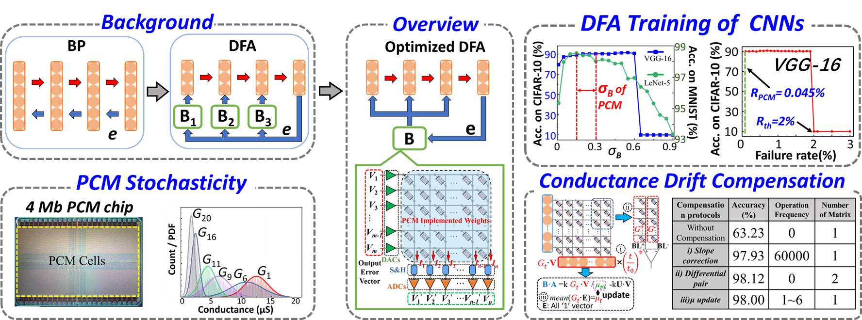 人工神经网络在社会各个领域都有广泛的应用。高效快速训练对于其进一步发展和应用意义重大,但传统误差回传算法(BP)存在耗时长、能耗大等问题。针对该问题,微纳电子学系杨玉超研究员、黄如教授团队提出了一种基于相变存储器(PCM)的高效人工神经网络训练系统。该系统利用PCM电导状态的内在随机性作为随机源,以存内计算方式产生用于训练的随机权重,对训练算法的有效简化提升了软硬件间的兼容性,多层次的优化策略有效降低了整个系统的硬件代价。该系统成功应用到大型卷积神经网络VGG-16的训练过程中,并且在CIFAR-10数据集上取得了超过90%的识别正确率,达到了与传统训练算法相当的水平,并将训练时间、能耗降低3倍以上。研究成果不仅推动了存内计算的进一步发展,也为人工神经网络在终端智能硬件平台上的片上训练及应用提供了新的方向。