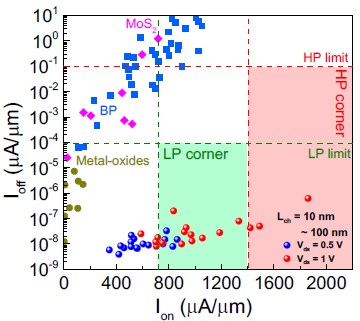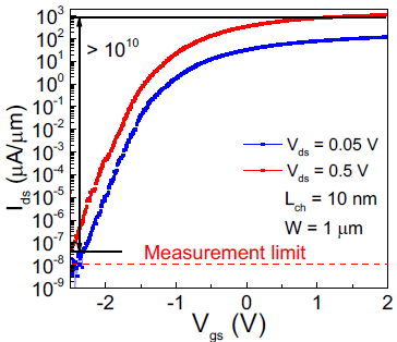 超薄沟道宽禁带氧化物半导体具备优越的短沟道效应抑制能力,国际上在三元氧化物IGZO晶体管上已经开展了多年相关的研究,但其非晶态迁移率非常低,不适于逻辑器件应用。针对该问题,微纳电子学系吴燕庆研究员、黄如教授团队另辟蹊径,在二元氧化物ITO(氧化铟锡)上克服了其载流子浓度大的问题,成功实现了从类金属态的高导电特性到宽禁带半导体的高绝缘特性转变,在厚度为3.5nm的ITO薄膜上成功制备了当前最小尺寸10nm沟长的高性能超薄ITO晶体管。在1V工作电压下,其开态电流超过1860μA/μm,关态电流小于40 fA/μm,开关比为1010,跨导超过1000μS/μm,性能远超同类器件,为国际报道最高纪录。该技术工艺温度低于200oC,与硅基CMOS集成电路后道工艺兼容,可用于未来三维集成技术。