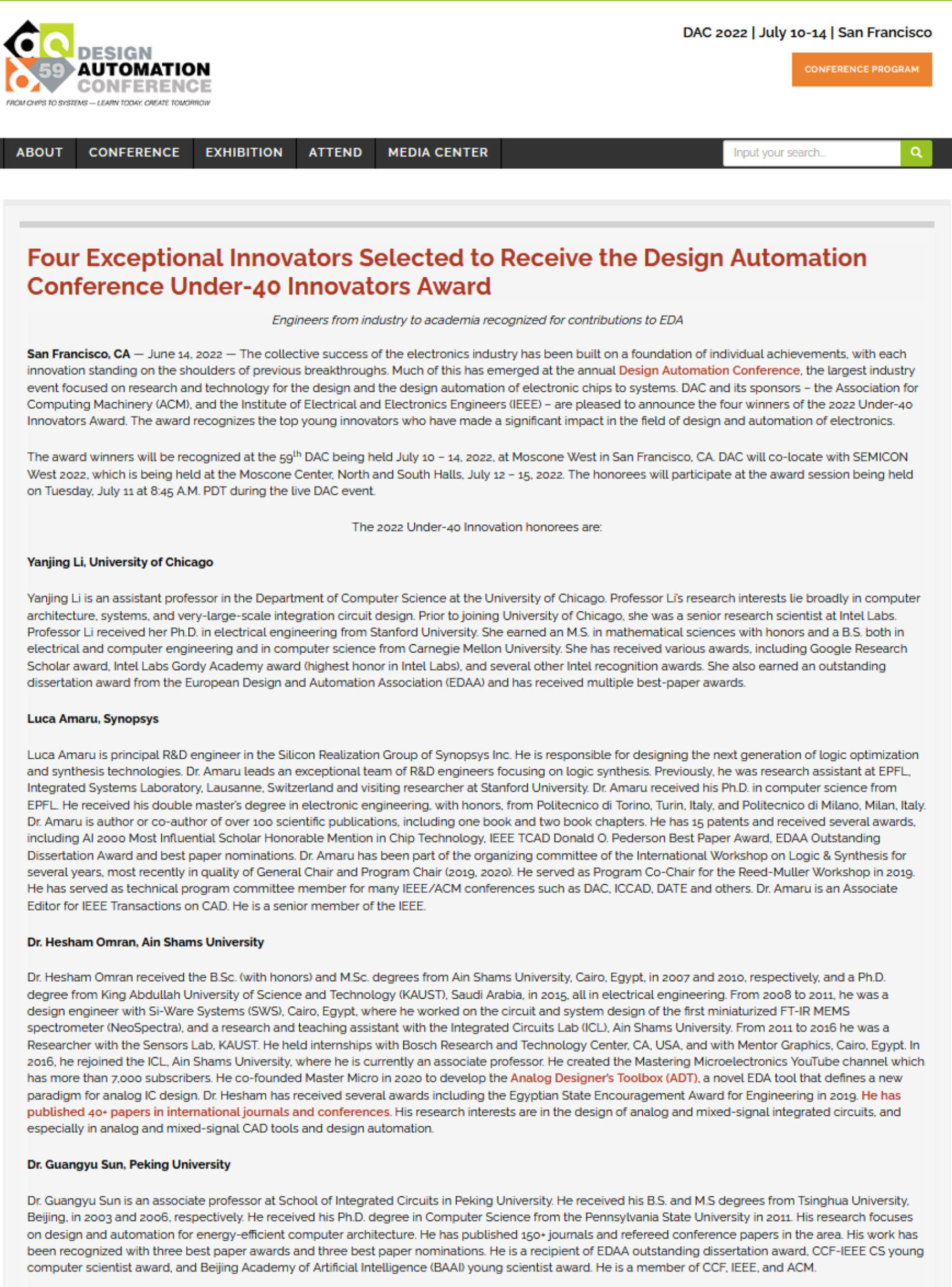 今年的奖项选出在逻辑综合、系统架构、电路设计等方向有突出贡献的四位代表,除了我院的孙广宇副教授,其他获奖者包括来自芝加哥大学的Yanjing Li、新思科技(Synopsys)的Luca Amaru和艾因沙姆斯大学的Hesham Omran。
