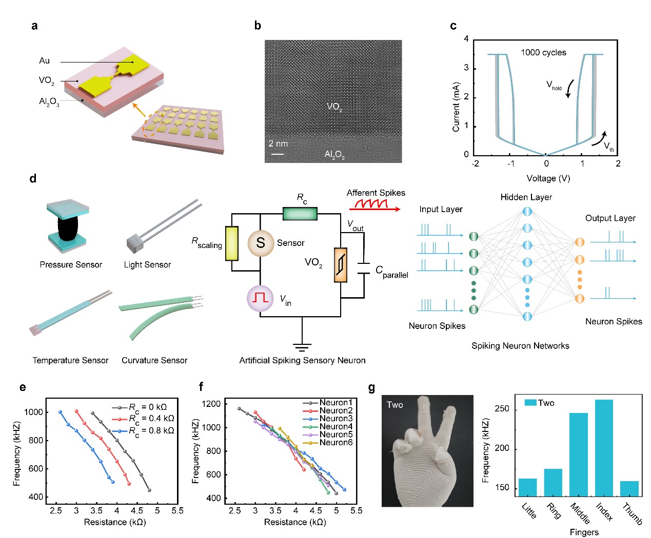 针对这一关键问题,成人影片 黄如院士-杨玉超教授课题组首次提出了一种基于外延VO2忆阻器的可校准感知神经元,用于解决人工感知神经元的一致性问题以及神经元与不同传感器阻抗匹配的问题。在材料层面上,外延生长的VO2高质量薄膜显著提高了人工神经元的周期间(cycle-to-cycle)一致性;在电路层面上,通过在神经元电路中引入校准电阻,有效调控了神经元的发放频率曲线,从而进一步提高了不同神经元之间(device-to-device)的一致性。为了解决神经元与不同类型传感器的阻抗匹配问题,进一步引入了缩放电阻用于将不同传感器的工作阻值调节到神经元所适配的阻值范围,从而实现了超高一致性、可校准、多模态的人工感知神经元。