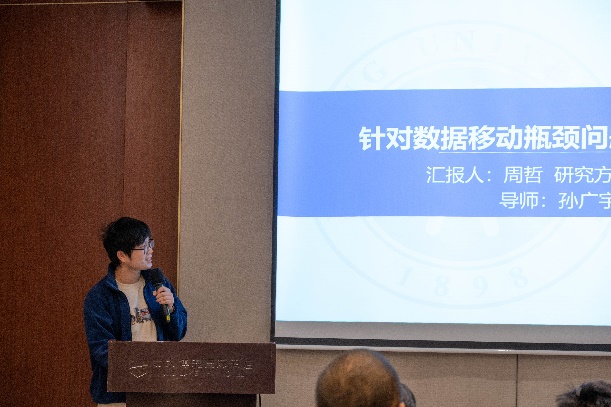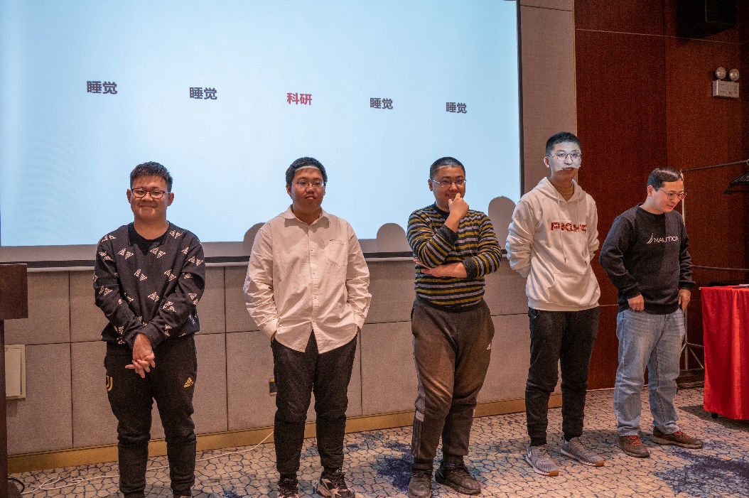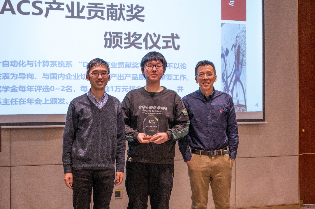 王润声教授致辞结束后,接着进行的是学术报告环节以及“DACS产业贡献奖”颁奖仪式。孙梓轩、高笑涵和周哲三位同学分别代表器件级、芯片级和系统级三个层次的科研方向做了简短的报告。本次DACS产业贡献奖的获奖者为张昊懿和徐瑞帆两位同学。两位同学上台领取了奖杯,并和导师、系主任一起进行了合影。