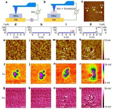 图1:通过导电原子力显微镜和静电力显微镜技术探测在不同电激励条件下氧化铪中氧离子运动和阻变的动力学过程及对应的局域形貌、电荷和介电常数变化。