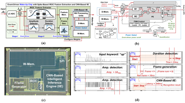 黄如院士-叶乐副教授课题组,与浙江省北大信息技术高等研究院、浙江大学、上海芯翼信息科技有限公司合作,提出了国际首创的异步事件驱动型AIoT芯片架构,解决了在随机稀疏应用场景下长时平均功耗高的问题,显著降低了AIoT节点设备的功耗;课题组同时提出了异步脉冲的信号特征提取方法,仅以几十nW的极低功耗代价便实现了信号特征提取;不仅如此,基于“时域帧生成器”和“卷积神经网络”智能推断引擎的技术,结合重训练机制,在具备低功耗的同时,使物联网应用场景因噪声而导致推断精度低的问题得以解决。...